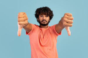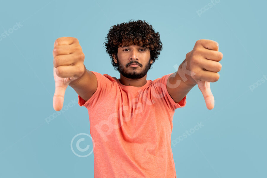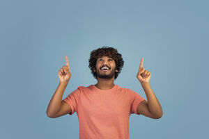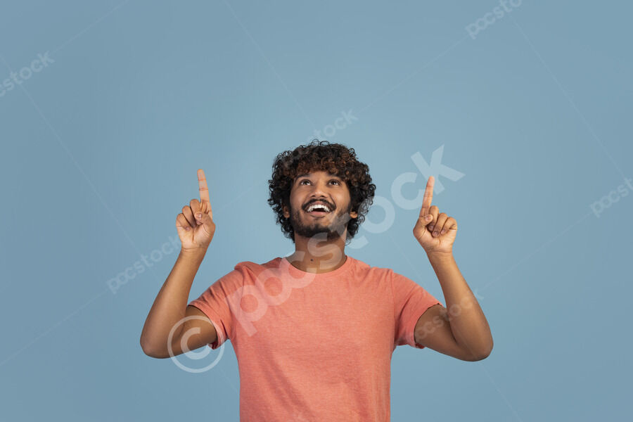 Bearded Indian male with curly hair pointing fingers up standing in front of blue background in studio