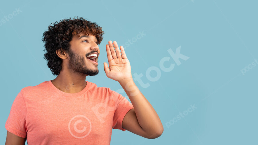 Smiling bearded Indian man with curly hair looking away shouting standing with hand near mouth in front of blue background in studio