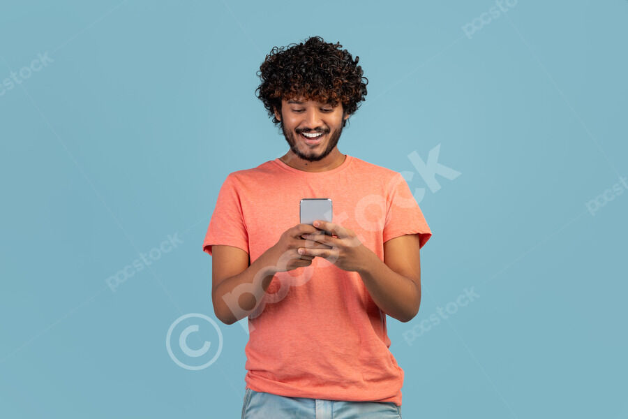 Smiling bearded Indian man with curly hair using smartphone while standing in front of blue background in studio