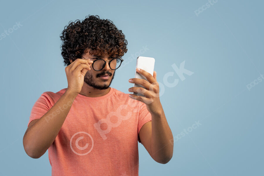 Bearded Indian man with curly hair touching eyeglasses using smartphone while standing in front of blue background in studio