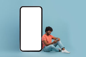 Bearded Indian male with curly hair sitting on floor near huge smartphone with blank screen in front of blue background in studio