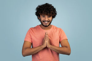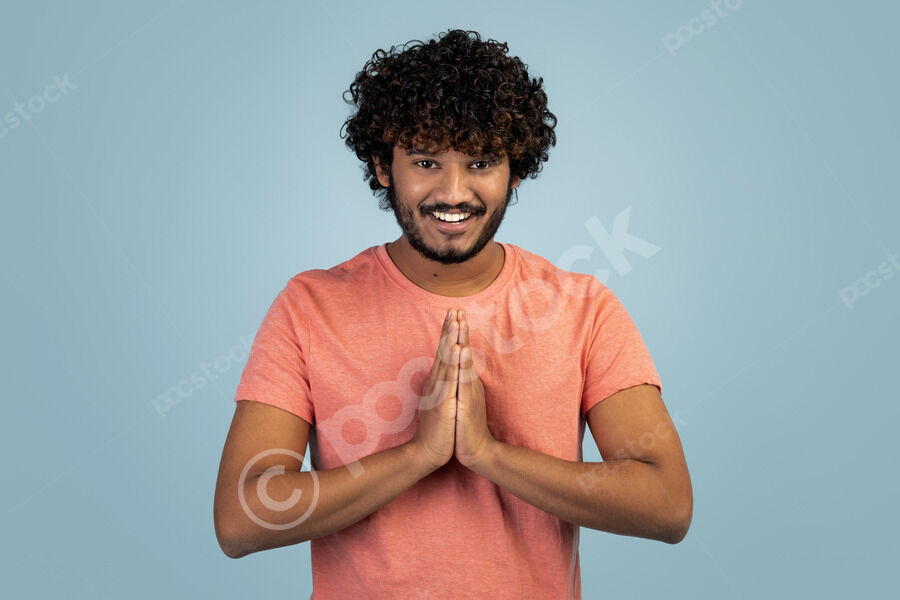 Smiling bearded Indian man with curly hair showing praying hands while standing in front of blue background in studio