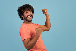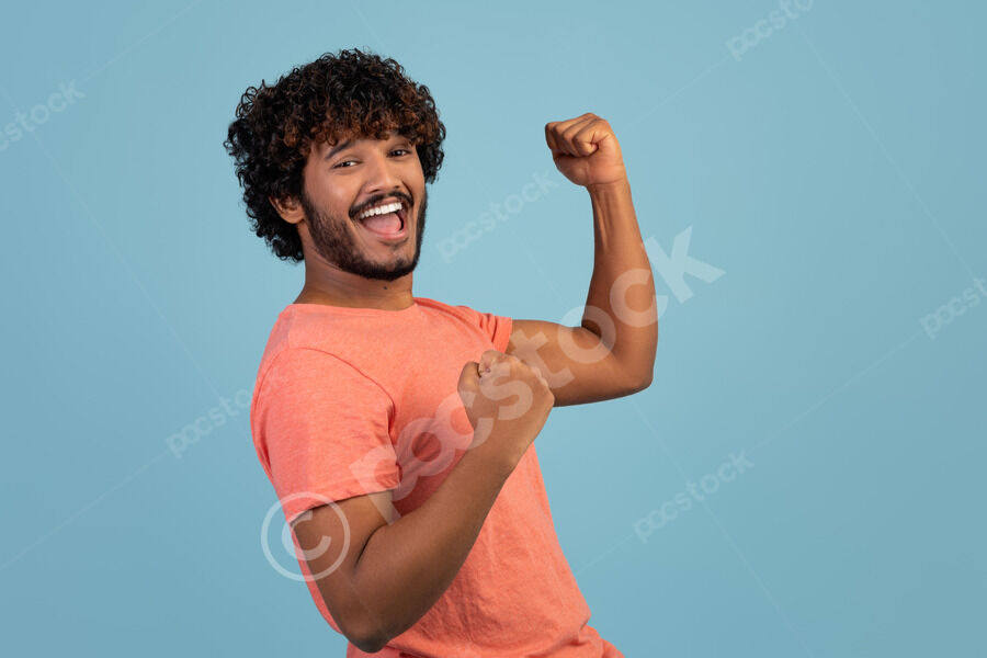 Smiling bearded Indian man with curly hair pumping fists standing sideways with in front of blue background in studio