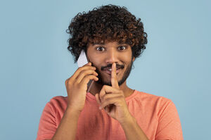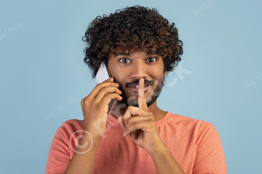 Closed-up image of smiling bearded Indian man with curly hair showing quiet hand gesture while talking on smartphone standing in front of blue background in studio