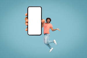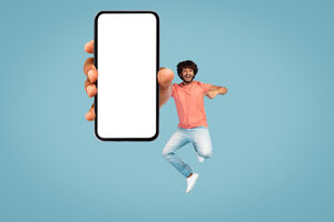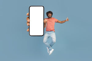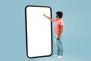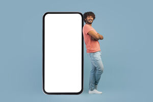 Bearded Indian man with curly hair standing near huge smartphone with blank screen in front of blue background in studio