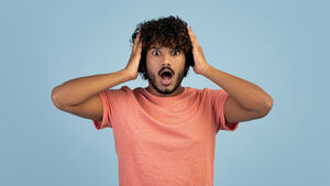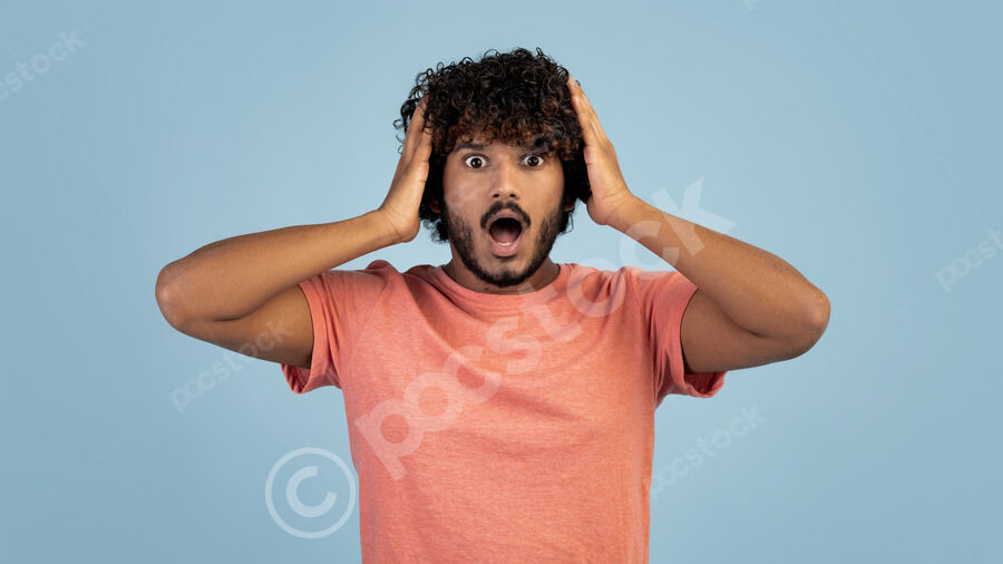 Shocked bearded Indian man with curly hair holding face with both hands standing in front of blue background in studio