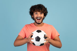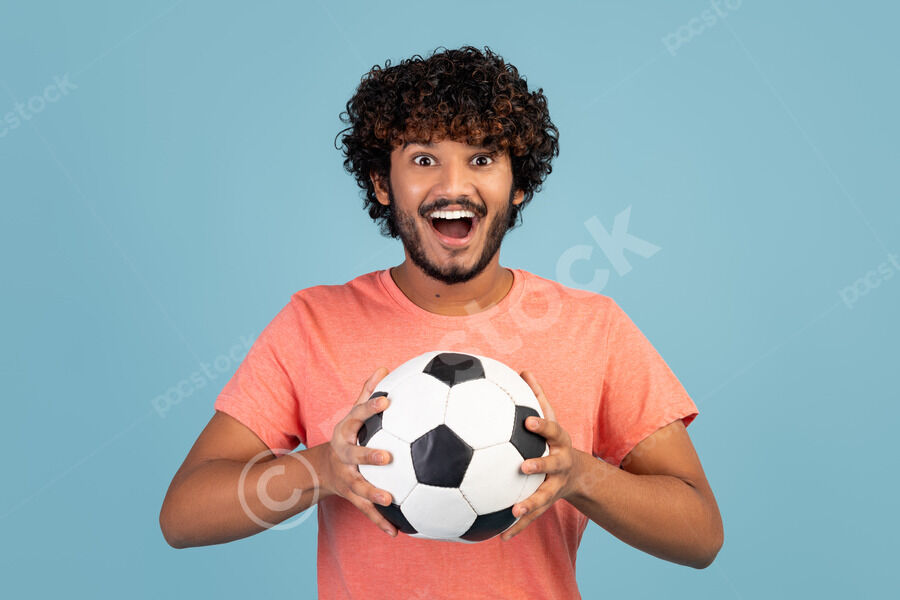 Smiling bearded Indian man with curly hair holding soccer ball with both hands while standing in front of blue background in studio