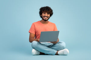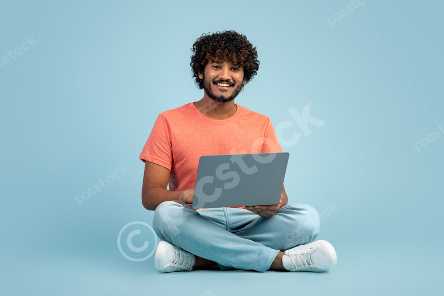 Smiling bearded Indian male freelancer with curly hair working on laptop sitting on floor in front of blue background in studio