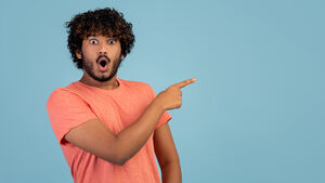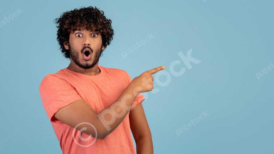 Shocked bearded Indian man with curly hair pointing finger forward while standing in front of blue background in studio