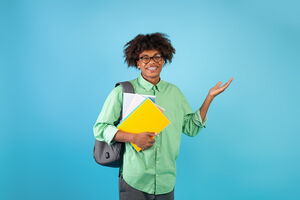 Black female doctor in eyeglasses holding pen and clipboard standing with diverse colleagues in hospital