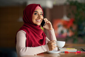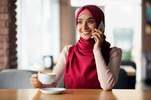 Indian Muslim woman in hijab having phone call holding coffee cup sitting at table in cafe