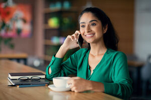 Indian woman looking away talking on smartphone having coffee sitting at table in cafe