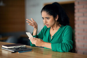 Disappointed Indian woman gesturing hand using smartphone sitting at table in cafe