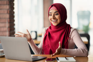 Indian Muslim woman in hijab wearing headset using laptop sitting at table in cafe