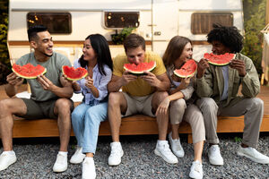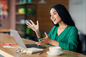 Indian woman looking over shoulder using laptop sitting at table in cafe