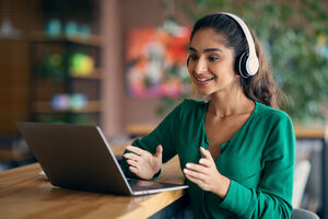 Indian woman wearing headphones gesturing hand having video call using laptop sitting at table in cafe