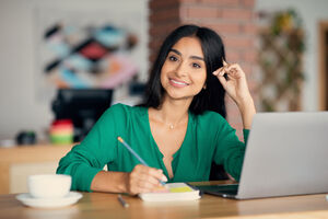 Indian woman using headset writing notes sitting at table with laptop in cafe