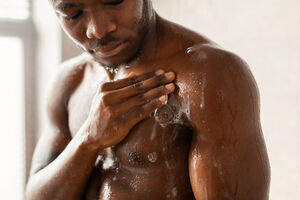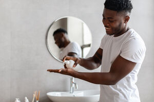 Black male with curly hair massaging temples suffering from headache standing with eyes closed in front of blue background in studio