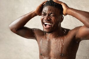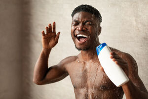 Black male with curly hair covering his ears with fingers standing with eyes closed in front of blue background in studio