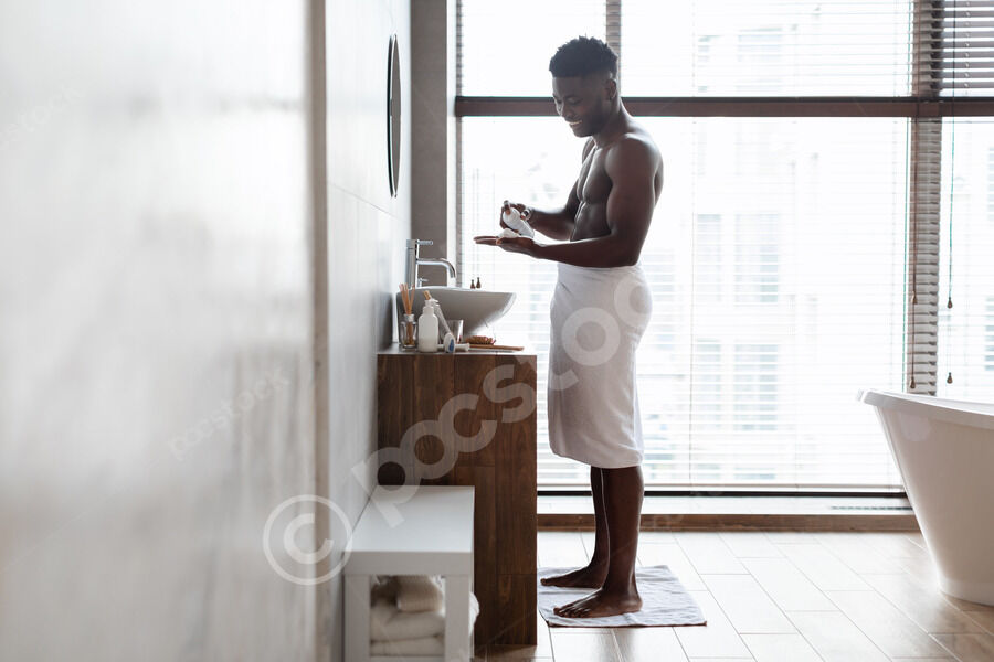 Black man with curly afro sitting with crossed legs on sofa in living room at home