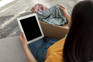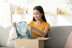 Black shirtless man with white towel showing moisturizing cream jar while standing in bathroom at home