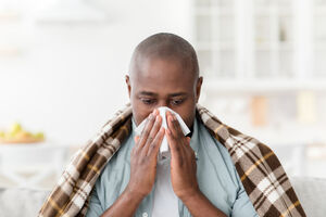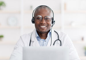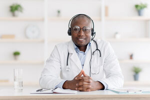 Black woman with open mouth sitting on chair having swab test done by female doctor standing against white wall