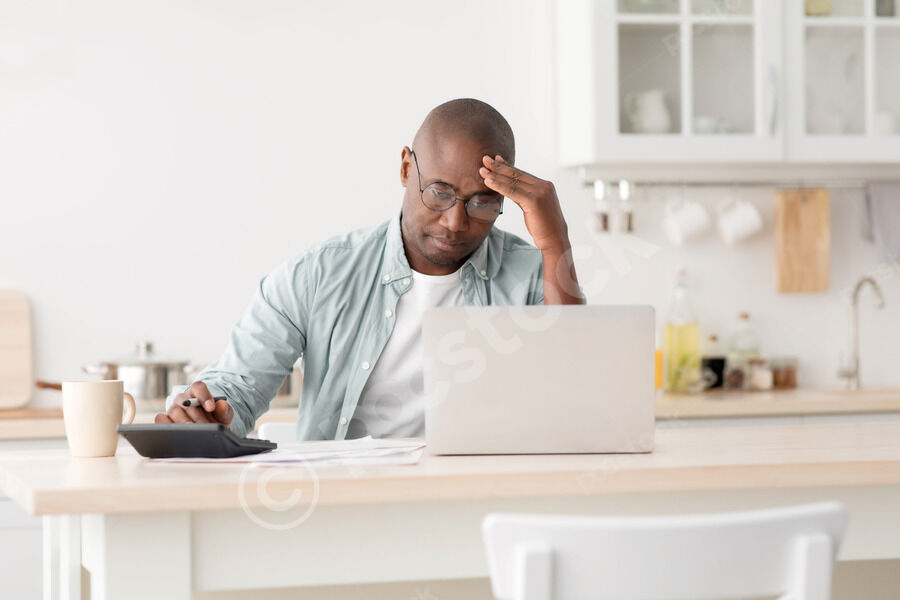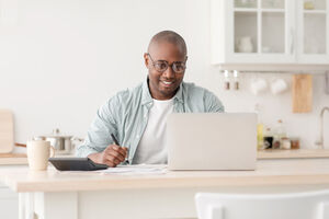Black mother and daughter sitting at table with laptop and notebook in living room at home