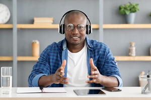 Black mother and daughter working on school project together while sitting at table with laptop and headphones in living room at home
