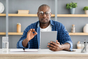 Black girl holding pencil doing homework while sitting at table with headphones and notebook in living room at home