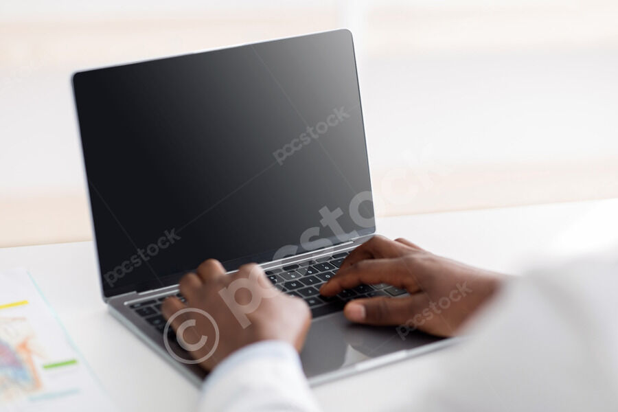Black mother using laptop near bored daughter leaning face on hands while sitting at table with notebook and pencils in living room at home