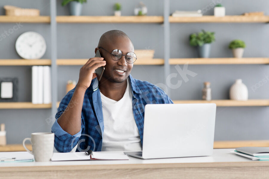 Angry Black girl doing homework talking to mother having phone call and using laptop while sitting at table in living room at home