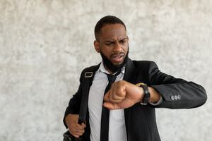 Black businessman holding jacket over his shoulder and looking away standing on city street during daytime