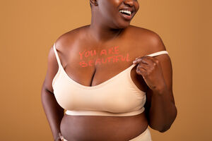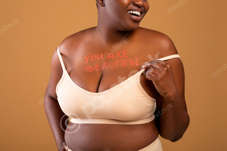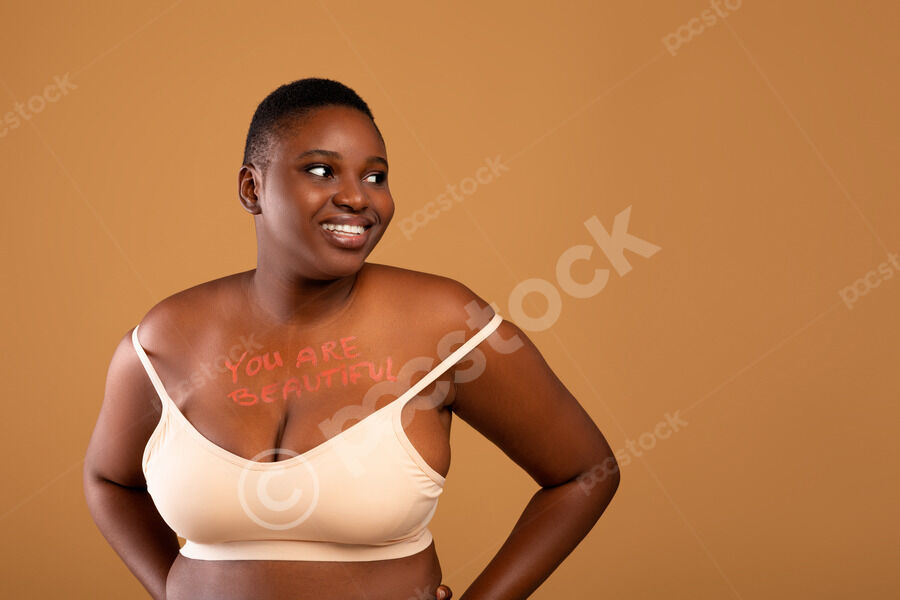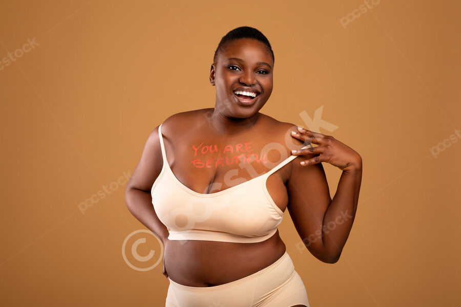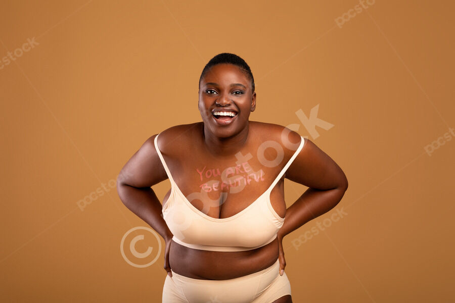 Black plus-sized woman wearing lingerie touching shoulder with you are beautiful written on her chest standing against brown background in studio