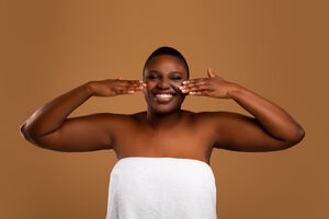 Black woman with short hair in white towel applying body lotion on shoulder standing against brown background in studio