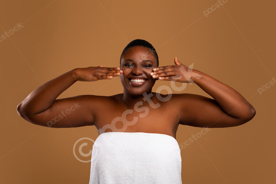 Black woman in bath towel with closed eyes touching face standing against brown background in studio