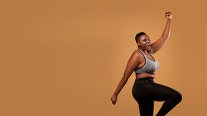 Cheerful Black woman with short hair wearing sportswear raising clenched fist while dancing against brown background in studio