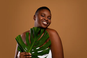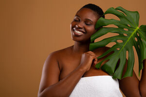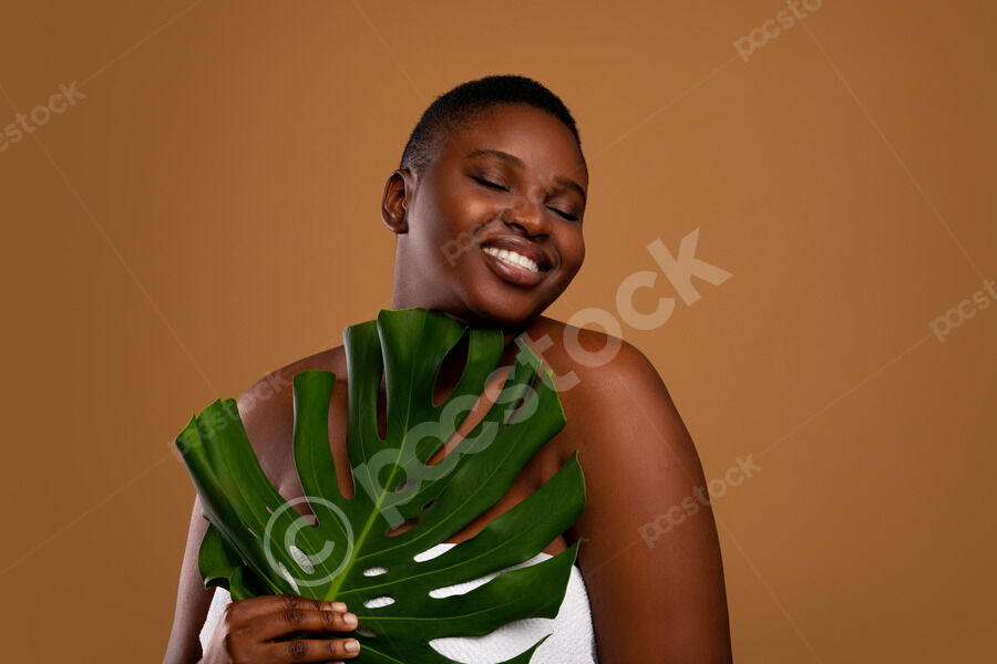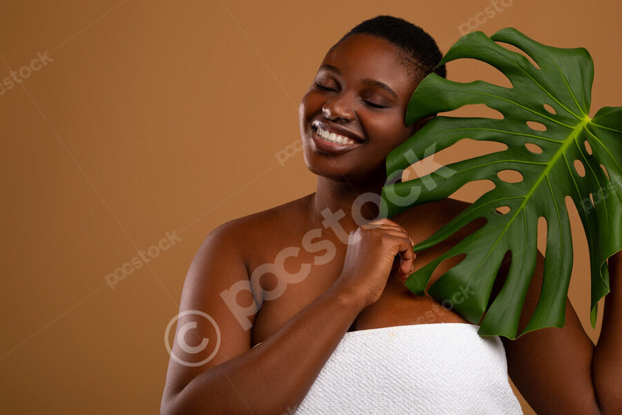 Smiling Black woman in bath towel with closed eyes holding monstera leaf covering half of her face standing against brown background in studio