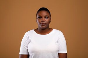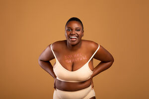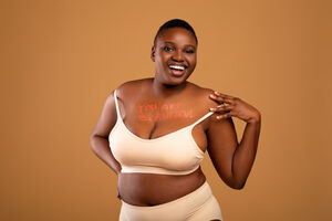 Black woman wearing lingerie with my body my choice written on her chest standing against brown background in studio