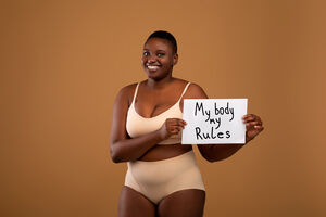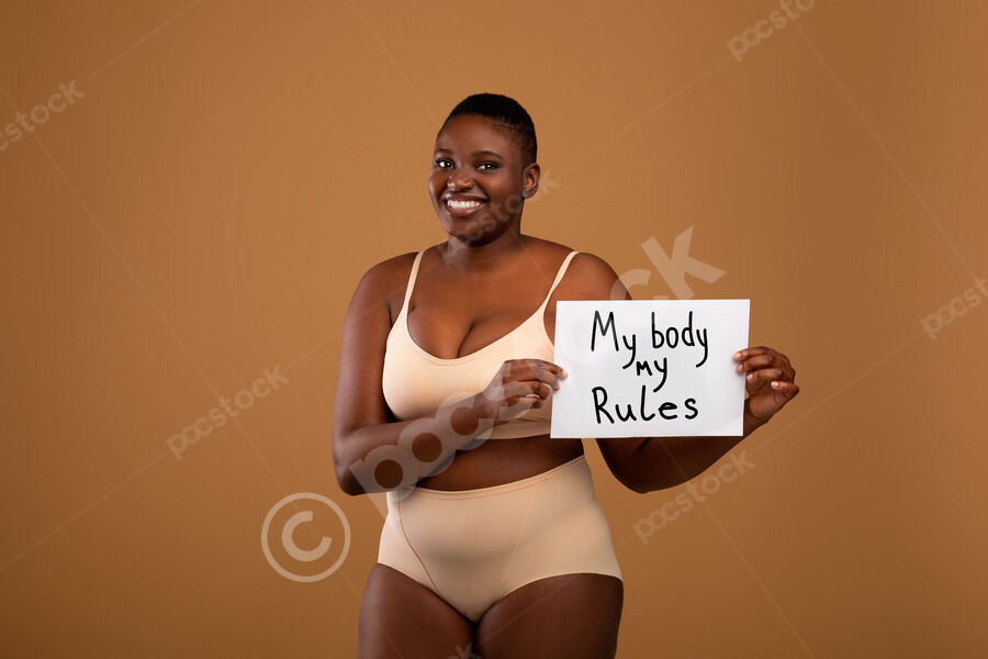 Smiling curvy Black woman with short hair wearing beige lingerie holding white board with may body my rules written standing against brown background in studio