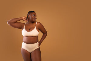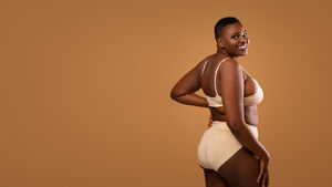 Smiling Black woman with short hair wearing lingerie looking over shoulder standing against brown background in studio