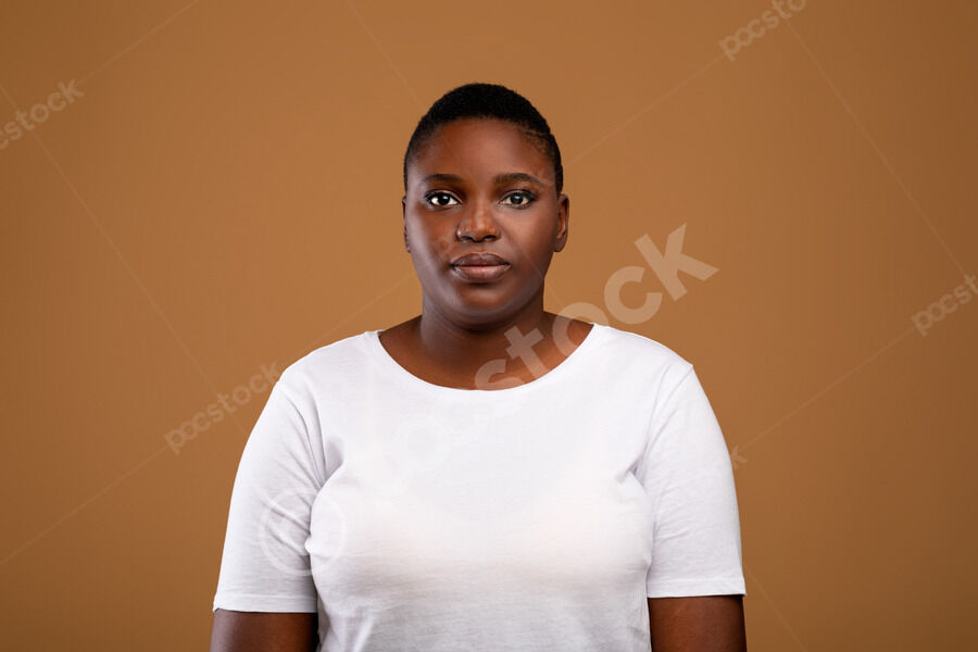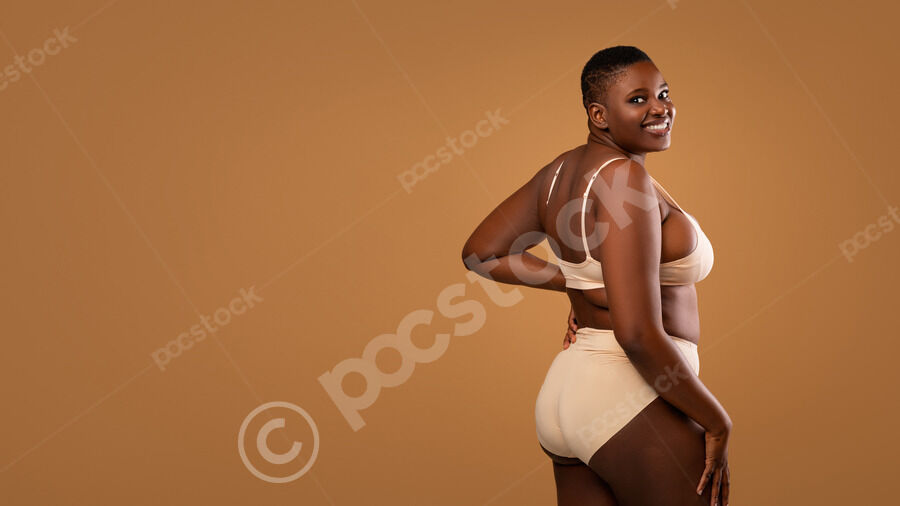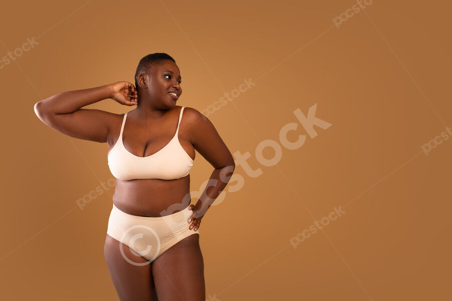 Curvy Black woman with short hair wearing lingerie touching neck with hand on waist standing against brown background in studio
