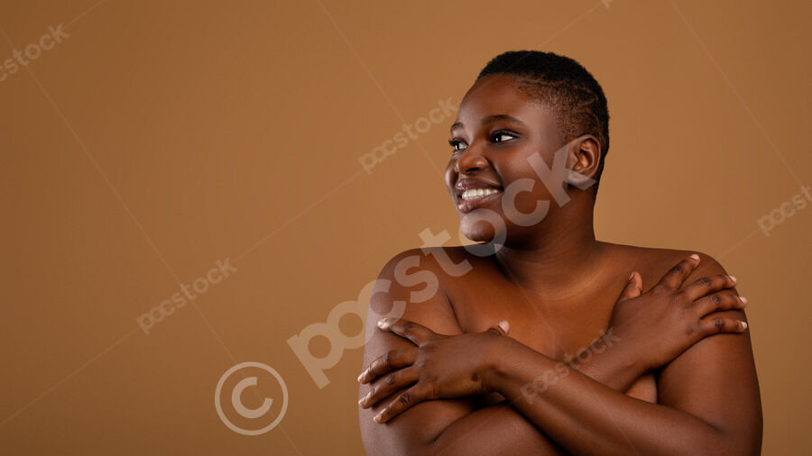 Black woman with short hair looking away embracing bare shoulders standing against brown background in studio