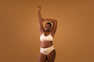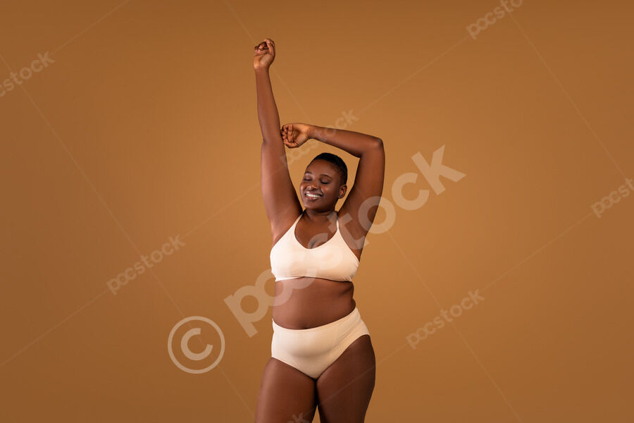 Smiling Black woman with short hair wearing lingerie raising arms standing against brown background in studio