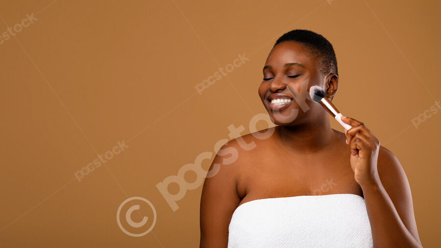 Black woman with short hair and closed eyes holding makeup brush applying powder on face standing against brown background in studio
