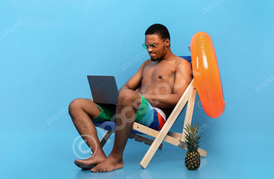 Black man in swimwear wearing sunglasses flexing muscles with laptop on lap sitting on lounge chair with inflatable ring against blue background in studio