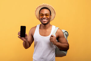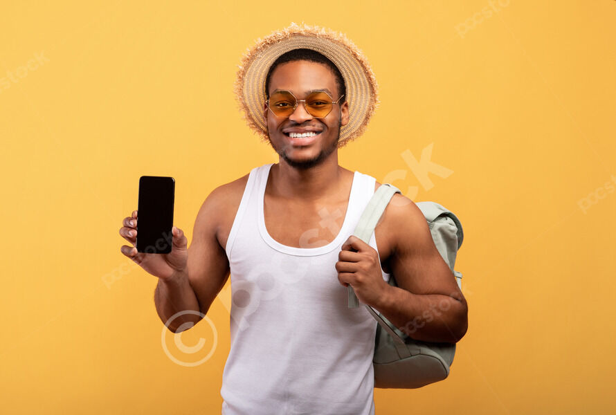 Smiling Black man wearing straw hat and sunglasses carrying backpack showing smartphone screen standing against yellow background in studio