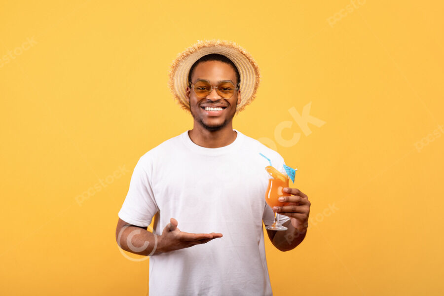 Black man wearing straw hat with open hand holding glass of tropical cocktail standing against yellow background in studio