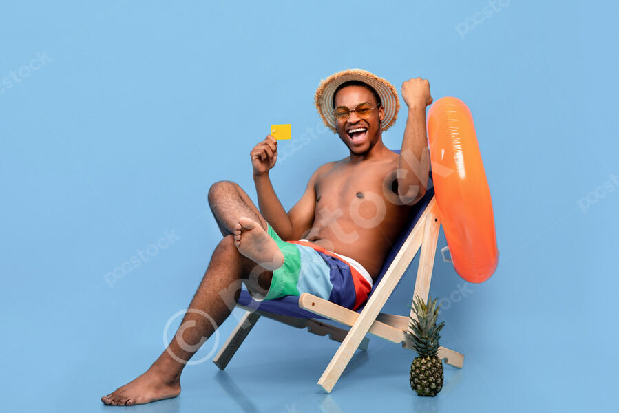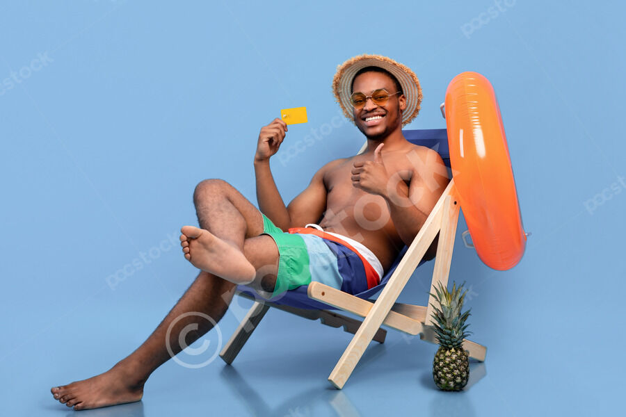 Black man wearing sunglasses and straw hat holding credit card sitting with crossed legs on lounge chair with inflatable ring against blue background in studio