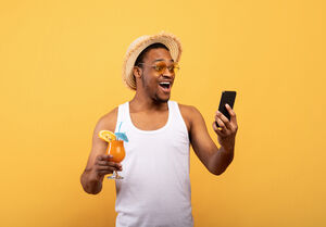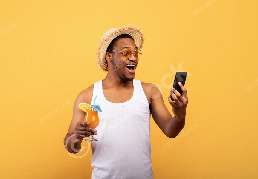 Smiling Black man wearing straw hat and sunglasses holding glass of tropical cocktail using smartphone standing against yellow background in studio