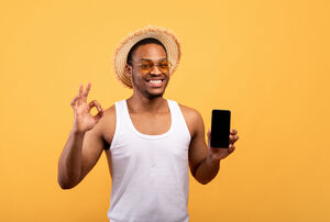 Black man wearing straw hat and sunglasses doing OK hand gesture while holding smartphone on the other hand standing against yellow background in studio